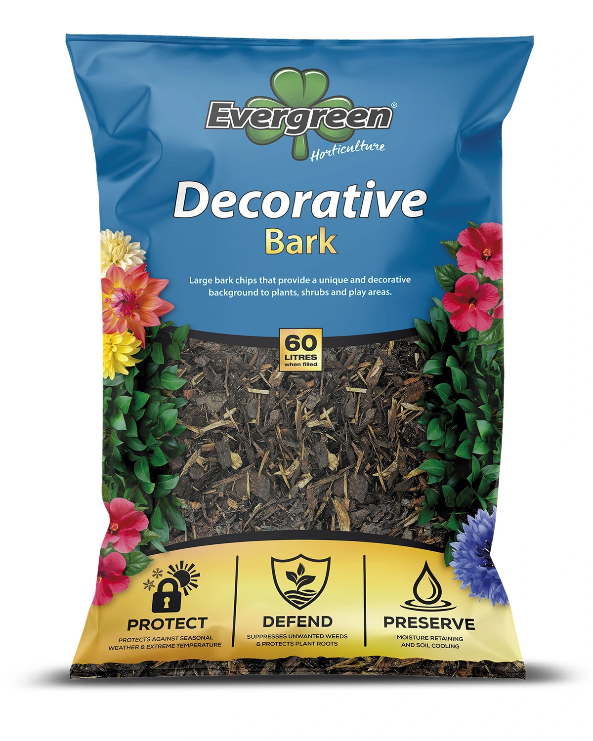Evergreen Decorative Chip Bark consists of large bark chips that provide a unique and decorative background to plants, shrubs and play areas. Not only does it decorate paths and borders, it also acts as a weed suppressant and minimises garden maintenance.