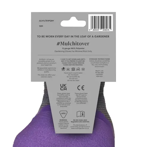 A gardening glove crafted from stretchy grey polyester fabric, featuring a thick textured dark grey latex palm and an extra wide elasticated cuff for comfort and flexibility. Lavender colour available in size M, blue colour available in size L. Choose your size below.