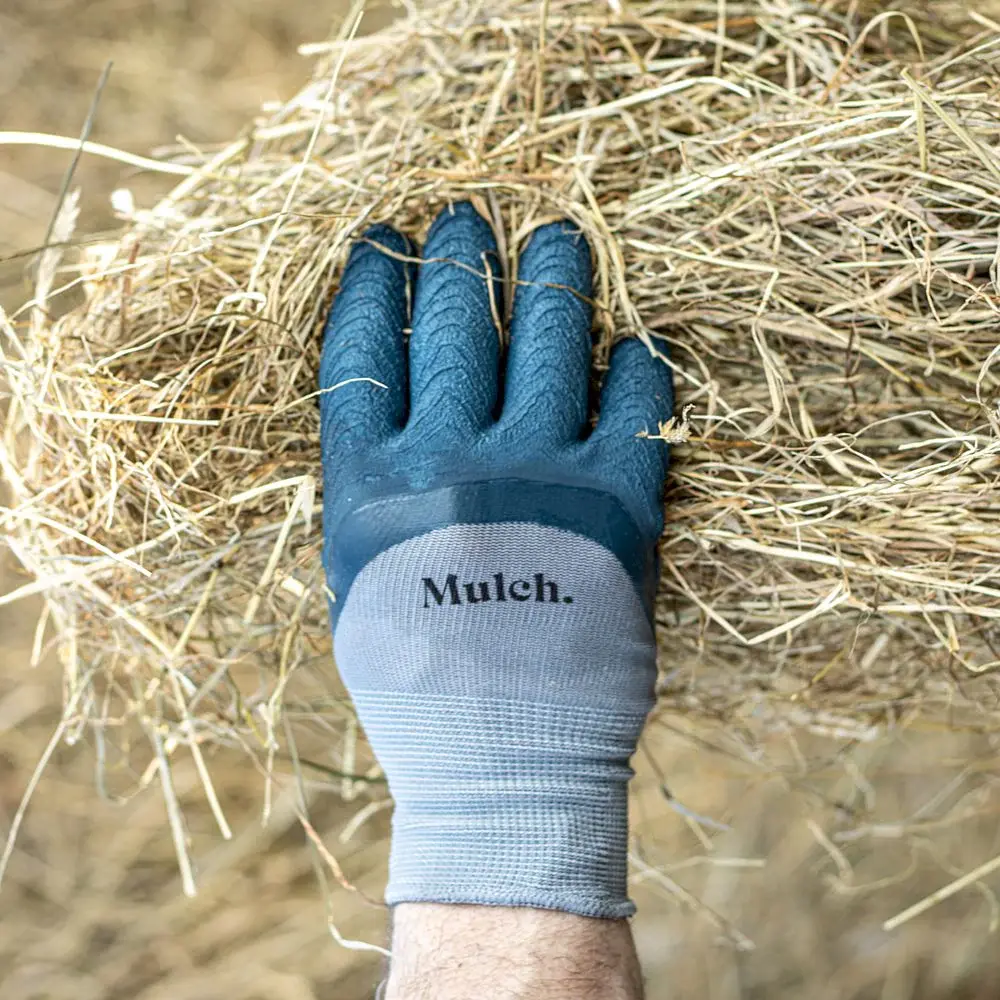 A gardening glove crafted from stretchy grey polyester fabric, featuring a thick textured dark grey latex palm and an extra wide elasticated cuff for comfort and flexibility. Lavender colour available in size M, blue colour available in size L. Choose your size below.
